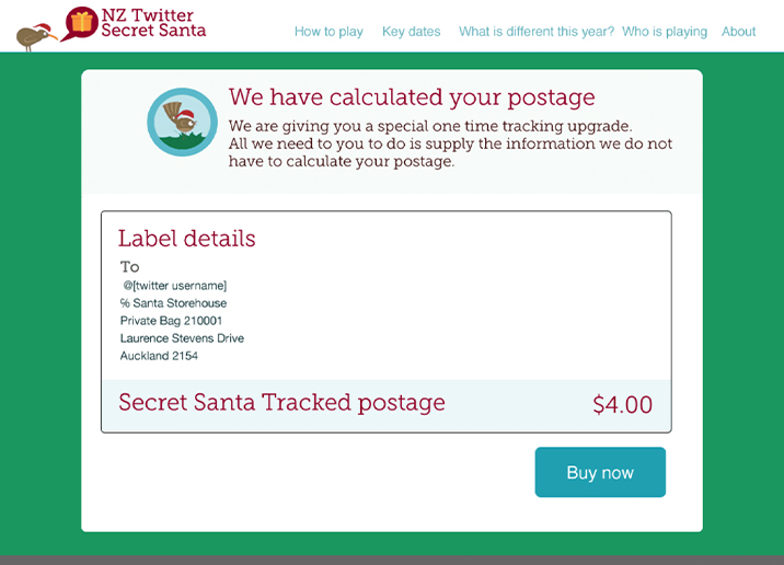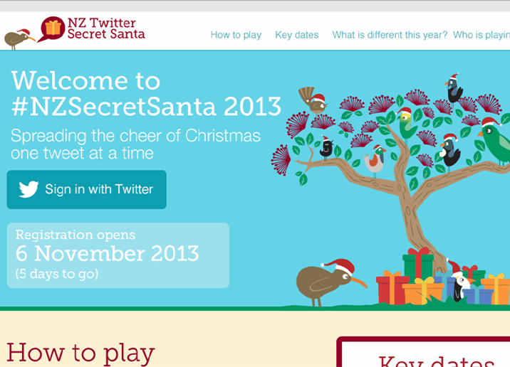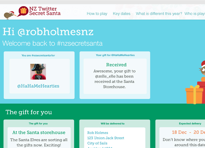 NZSecretSanta is a social media Secret Santa game run by New Zealand Post. Spreading the cheer of Christmas one tweet at a time.