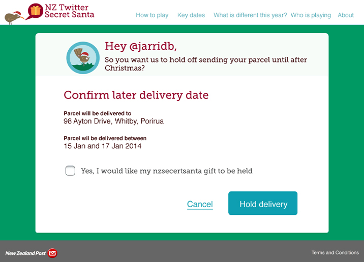 While the #nzsecretsanta takes place on twitter, the campaign needed a website to allow new players to be able to get an overview of the game worked and also allow users to sign up and link their twitter account to a New Zealand Post online account so they could manage their postage for the game.