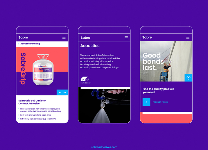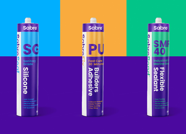Violet, coral, light blue, honey yellow and jade green position Sabre Adhesives as brave and confident in a space historically dominated by grey, red and dark blues. Our contrasting yet complementary palette helps tradies and fabricators to easily differentiate between Sabre products on the fly. Sabres new brand and packaging lineup reflects their commitment to building lasting bonds and strong customer relationships. Good bonds last.